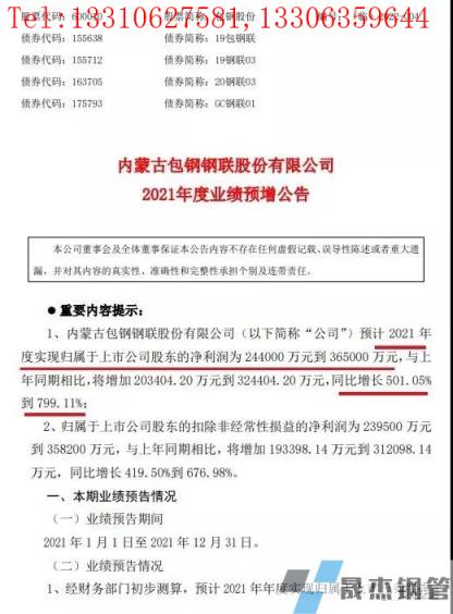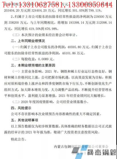 1月11日晚,鋼鐵板塊的牛股包鋼股份公布業(yè)績預告,預計2021年度實現(xiàn)歸屬于上市公司股東的凈利潤為24.4億元到36.5億元,與上年同期相比,將增加20.34億元到32.44億元,同比增長501.05%到799.11%;歸屬于上市公司股東的扣除非經(jīng)常性損益的凈利潤為23.95億元到35.82億元,與上年同期相比,將增加19.34億元到31.21億元,同比增長419.50%到676.98%。