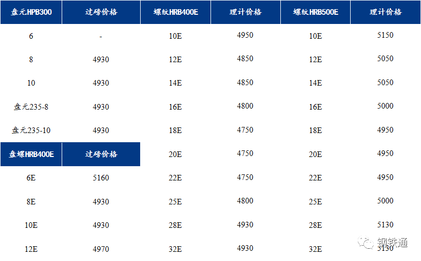 1、螺紋鋼平穩(wěn):Φ18、22mmHRB400E螺紋鋼指導(dǎo)價格4680元,12mm加價130元/噸,14mm加價100元/噸,16mm加價70元/噸,20mm加價70元/噸,25mm加價70元/噸,28-32mm加價130元/噸,36-40mm加價300元/噸,HRB500E高強(qiáng)度同規(guī)格加價300元/噸。