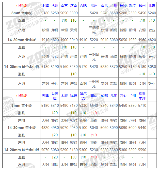 全國23個(gè)主要市場14-20mm 普中板平均價(jià)格5017元/噸,較上個(gè)交易日下調(diào)3元/噸。