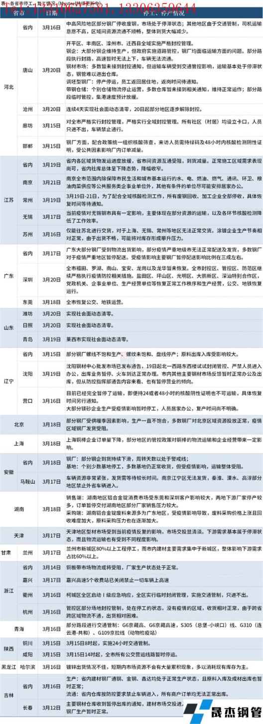 好像是一夜之間,疫情再次卷土重來。截至3月21日,16個省份停工復工情況見下表。其中,3月21日,南京全市范圍內除保障市民生活和城市基本運行的水、電、燃油、燃氣、通信、環衛、糧油肉菜供應等公共服務類企事業單位外,其他有條件的單位盡可能安排居家辦公。3月20日,唐山開平區、豐南區、灤州市、遷西縣全域實施嚴格封控管理;大部分鋼企維持生產,但政府實施道路管控,無縫鋼管廠家均面臨運輸方面的問題。深圳全市福田、羅湖、南山、寶安、龍崗以及龍華暫未恢復,全市封控區、管控區、防范區繼續嚴格執行疫情防控相關措施。山東濰坊、日照、青島萊西市實現社會面動態清零。河北滄州連續4天實現社會面動態清零,3月20日起部分地區逐步解除封控。