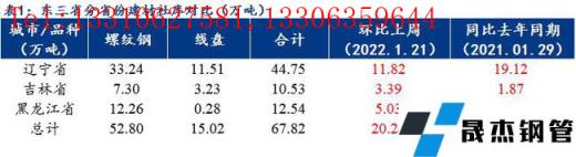 本周東三省建筑鋼材現(xiàn)貨庫存增加較多,增幅明顯超上周,其中螺紋鋼現(xiàn)貨庫存52.8萬噸,線盤15.02萬噸,建材社會(huì)庫存總量為67.82萬噸,較上周增20.24萬噸,增幅高達(dá)42.54%。隨著春節(jié)的臨近,北方下游終端工程進(jìn)入全停工狀態(tài),需求已無,出貨趨零,加之各個(gè)無縫鋼管廠家廠庫前移至市場(chǎng)各倉庫的現(xiàn)貨相對(duì)較多,社庫開始大幅度累庫。