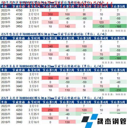 小編匯總了近5年春節(jié)前后東北建筑厚壁無縫鋼管市場價格變化情況,除2020年受公共衛(wèi)生事件影響平穩(wěn)運行外,其余年份節(jié)后首周多數(shù)都是“開門紅”狀態(tài),在第4-5周基本會出現(xiàn)沖高后回調(diào)的情況。具體情況如下: