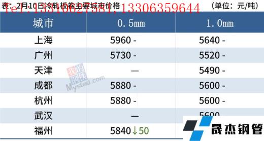 冷軋板卷:2月10日,全國24個主要城市1.0mm冷卷均價5593元/噸,較上個交易日下跌1元/噸。今日黑色系期貨盤面整體呈低開高走的態勢,在期貨盤面的影響下,午后市場詢單人數明顯增加,但由于下游客戶觀望情緒較為濃厚,今日整體成交一般。庫存方面,據不完全統計,現冷軋無縫厚壁鋼管廠家庫存43.71萬噸,周環比增加0.5萬噸,社會庫存139.17萬噸,周環比增加5.47萬噸,周消費量67.89萬噸,環比減少1.26萬噸。綜合來看,故預計11日國內冷軋板卷價格或將震蕩運行。