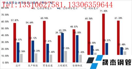 本次調(diào)研的3805家鋼鐵企業(yè)中,已全部復(fù)工企業(yè)2202家,已經(jīng)部分復(fù)工企業(yè)1125,尚未復(fù)工企業(yè)478,占比分別為57.87%、29.57%、12.56%。同期相比,已經(jīng)復(fù)工企業(yè)較去年降低了8個(gè)百分點(diǎn),尚未復(fù)工企業(yè)比例增加1個(gè)百分點(diǎn),部分復(fù)工企業(yè)占比上升較為明顯。