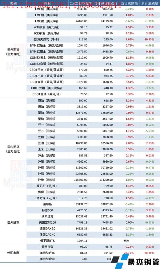 免責聲明:本網站(山東聊城晟杰無縫鋼管廠www.ahcom.com.cn)刊載的“受近期局勢影響大宗商品價格一覽表(2月28日)”等均源于網絡,版權歸原作者所有,且僅代表原作者觀點,本文所載信息僅供參考。轉載僅為學習與交流之目的,如無意中侵犯您的合法權益,請及時聯系刪除。本網站刊登此篇文章并不意味著本站贊同其觀點或證實其內容的真實性,我們不對其科學性、嚴肅性等作任何形式的保證。如果侵犯了您的版權,請盡快聯系我們予以撤銷,謝謝合作!