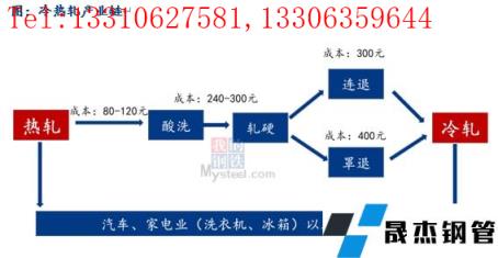 由于熱軋是冷軋的原料,調(diào)研了解有近40%的熱軋被用來生產(chǎn)冷軋,而且冷熱軋終端需求分布有部分重合,因此冷軋與熱軋價格走勢高度類似。冷軋板卷是以熱軋卷為原料,在室溫下經(jīng)過酸洗(費(fèi)用80-120元/噸)、軋制(費(fèi)用240-300元/噸),然后連退(費(fèi)用300元/噸)或罩退(費(fèi)用400元/噸)而成,冷軋成本較熱軋多出620-820元/噸。從下游需求分布來看,冷熱軋終端需求分布有部分重合,冷熱軋均被用于汽車、家電業(yè)(洗衣機(jī)、冰箱)以及產(chǎn)業(yè)設(shè)備等。