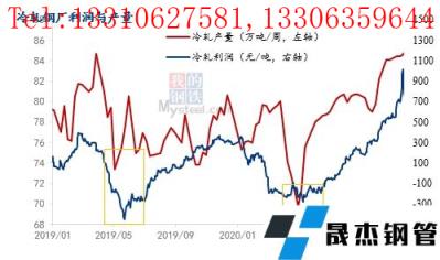 由于考慮到訂單、排產(chǎn)、后續(xù)市場情況等多種因素,無縫厚壁鋼管廠家生產(chǎn)計(jì)劃需提前制定,因此無縫厚壁鋼管廠家不會輕易減少產(chǎn)量。我們分析歷史情況發(fā)現(xiàn),在虧損較大后,冷軋產(chǎn)量才會有明顯的下降。由于2021年政策影響較大,我們選取2019-2020年冷軋無縫厚壁鋼管廠家的產(chǎn)量和利潤情況發(fā)現(xiàn),產(chǎn)量最低的兩個時間點(diǎn)分別為2019年5月底以及2020年5月底,這兩個時間點(diǎn)對應(yīng)的冷軋利潤也到達(dá)最低點(diǎn),分別為-450元/噸和-279元/噸。