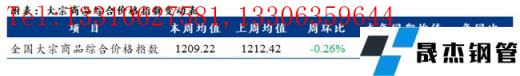 全國(guó)大宗商品綜合價(jià)格指數(shù)均值為1209.22,環(huán)比下降,降幅0.26%(前值4.39%);同比上升,增幅15.19%(前值17.06%)。