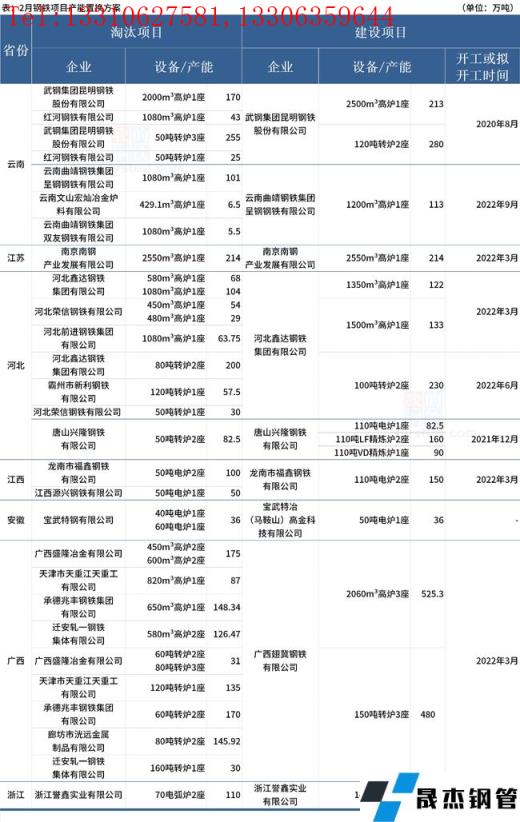 據不完全統計,2022年2月有9家無縫厚壁鋼管廠家發布鋼鐵產能置換方案。其中,涉及新建煉鋼產能1328萬噸,新建煉鐵產能1320.3萬噸;涉及淘汰煉鋼產能超1567.92萬噸,淘汰煉鐵產能1395.56萬噸。