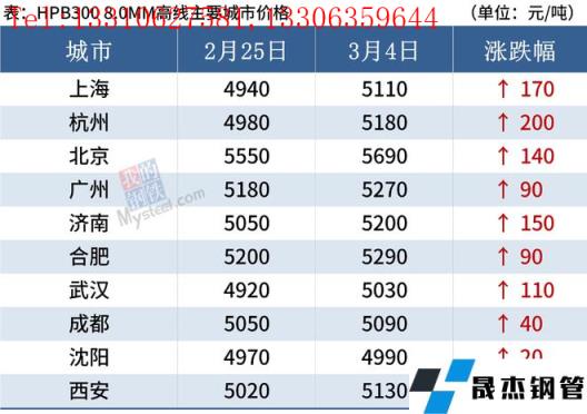 據監測,截至3月4日,全國主要城市20mm三級抗震螺紋鋼均價4946元/噸,周環比上漲77元/噸;8.0mmHPB300高線均價5161元/噸,周環比上漲94元/噸。