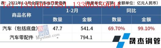 免責聲明:本網站(山東聊城晟杰無縫鋼管廠www.ahcom.com.cn)刊載的“海關總署:1-2月中國出口汽車47.7萬輛,同比增99.10%”等均源于網絡,版權歸原作者所有,且僅代表原作者觀點,本文所載信息僅供參考。轉載僅為學習與交流之目的,如無意中侵犯您的合法權益,請及時聯系刪除。本網站刊登此篇文章并不意味著本站贊同其觀點或證實其內容的真實性,我們不對其科學性、嚴肅性等作任何形式的保證。如果侵犯了您的版權,請盡快聯系我們予以撤銷,謝謝合作!