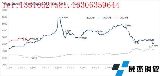 2月,山東建筑厚壁無縫鋼管價格窄幅震蕩上行。截至2月28日,山東建筑厚壁無縫鋼管價格(螺紋鋼為例)從上月跌4800元/噸上漲至4810元/噸,環(huán)比上漲10元/噸、漲幅0.2%。全月最高價格4930元/噸,最低價格4750元/噸,波動幅度180元/噸。雖然2022年2月平均價格較去年上漲了392元/噸,較2020年上漲了1243元/噸,但是對比來看,今年2月震蕩幅度相對較小,價格要溫和的多。