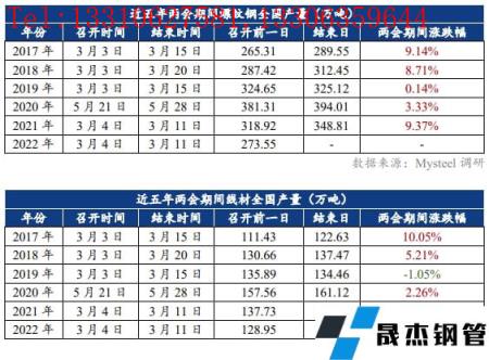 近五年建筑厚壁無縫鋼管庫存走勢稍顯分化,2018年和2021年兩會后庫存都有增量,螺紋鋼基本在5%左右,線材在1.5%左右;而2017年、2019年和2020年都有所下降,螺紋鋼庫存降幅在10%左右,線材降幅在13%左右。今年和往年“兩會期間”相比庫存也處于平均線下的低位。