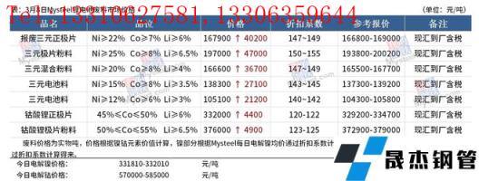 3月8日三元前驅(qū)體市場(chǎng)價(jià)格持平,523型14-14.5萬(wàn)元/噸;622型14.8-15.2萬(wàn)元/噸;811型15-15.6萬(wàn)元/噸。