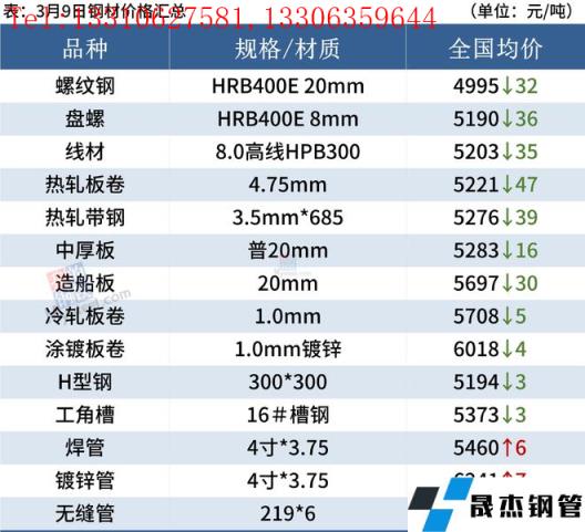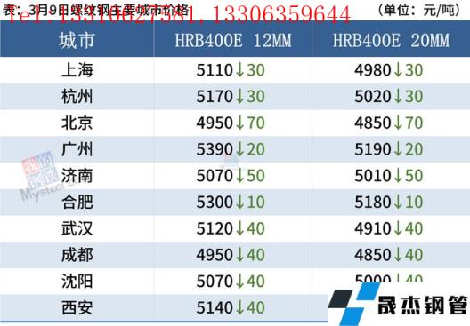 建筑厚壁無縫鋼管:3月9日,全國31個主要城市20mm三級抗震螺紋鋼均價4995元/噸,較上個交易日跌32元/噸。綜合來看,需求方面,目前下游工程項目資金情況尚未有明顯好轉,采購剛需為主,市場投機情緒降溫后,整體成交表現較為一般。而期貨市場的波動影響市場心態,因此預計10日國內建筑厚壁無縫鋼管價格將繼續弱勢震蕩運行。