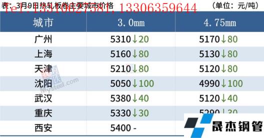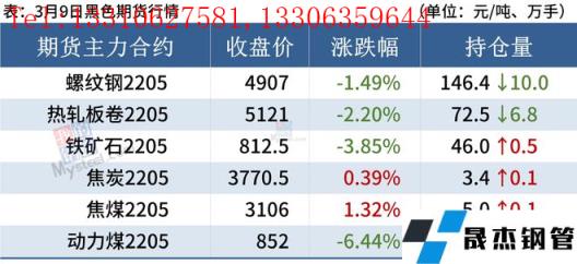 熱軋板卷:3月9日,全國24個主要城市4.75mm熱軋板卷均價5221元/噸,較上個交易日下跌47元/噸。黑色商品期貨市場震蕩下跌,早盤走弱,現貨報價小幅下跌,成交表現不佳,午后期卷繼續走低,下游采購量收縮,全天成交較差,商家套現意愿增強。綜合來看,前期熱卷期現貨價格大幅拉漲,市場恐高情緒濃厚,高價位成交受阻,需求釋放不及預期,商家欲獲利套現,價格出現一定程度回落,但高成本和低庫存以及國內外價差都將抑制鋼價大幅下跌。綜合來看,預計10日熱軋板卷價格或震蕩偏弱為主。