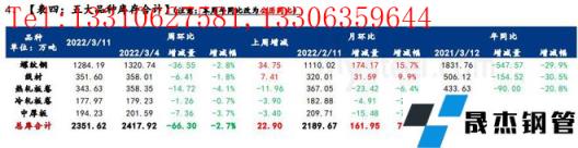 庫存方面,五大品種厚壁無縫鋼管總庫存春節(jié)后連續(xù)首次全面去化,環(huán)比上周減少66.3萬噸,降幅2.7%。分品種看,建材庫存減少42.96萬噸,降幅為2.6%;板材庫存減少23.34萬噸,降幅3.2%;分指標(biāo)看,五大品種無縫厚壁鋼管廠家?guī)齑姝h(huán)比減少39.26萬噸,降幅6.2%;五大品種社會庫存環(huán)比減少27.04萬噸,降幅1.5%。