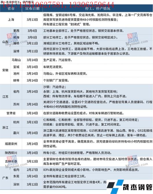 近期,全國疫情呈現(xiàn)局部高度聚集和多點散發(fā)態(tài)勢,對國內大宗商品市場的供應端、需求端、物流及倉儲等方面都有不同程度的影響。據統(tǒng)計,截至3月15日,全國多個省市發(fā)布停工停產情況。其中受疫情影響最大的吉林省于3月12日宣布,長春市主要厚壁無縫鋼管倉庫暫停出庫,當地建材市場交投進入暫時停滯狀態(tài),倉庫入庫及本地無縫厚壁鋼管廠家生產暫時正常。深圳市于3月12日宣布,全市范圍內所有建設工地暫定停工排查4天,南山及福田區(qū)域厚壁無縫鋼管市場預計共影響需求量約6640噸。與此同時,全國其他地區(qū)鋼貿交易也受到影響,部分工地開始停工,物流運輸暫停服務。具體情況如下: