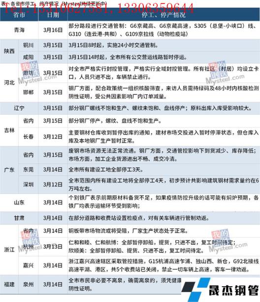 截至3月16日,匯總了10個省份最新停工停產(chǎn)信息。其中,廣東省3月15日開始,廢鋼市場資源無法正常流通;無縫厚壁鋼管廠家方面,交通管控影響下到貨減少、庫存降低;市場方面,加工企業(yè)貨源進出不暢、成交冷清。陜西省銅川市于15日宣布全市范圍內(nèi)實施24小時交通管制;咸陽市15日宣布全市所有公交營運路線暫時停運。吉林省部分無縫厚壁鋼管廠家停產(chǎn),螺紋、盤線不飽和生產(chǎn)。與此同時,全國其他地區(qū)鋼貿(mào)交易也受到影響,部分工地開始停工,物流運輸暫停服務(wù)。具體情況如下: