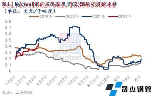 進(jìn)入2022年,鐵礦石遠(yuǎn)期現(xiàn)貨62.5%塊礦溢價(jià)(以下簡(jiǎn)稱遠(yuǎn)期塊礦溢價(jià))大幅反彈,由1月初的0.1945美元/干噸度漲至目前的0.4465美元/干噸度,累計(jì)上漲0.252美元/干噸度,漲幅130%(圖一)。其中,一季度漲幅接近去年同期水平但遠(yuǎn)高于2020年同期。本文主要從基本面、焦炭、替代品三個(gè)因素來分析此輪塊礦溢價(jià)大幅上升的原因,同時(shí)對(duì)其短期走勢(shì)做出預(yù)判。