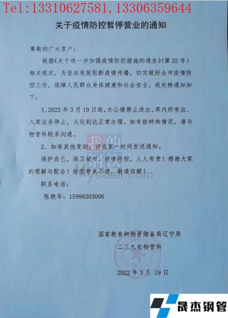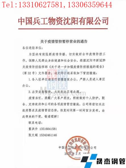 目前沈陽厚壁無縫鋼管中心批發市場已發布通告,19日起北一西路東西樓試試封閉管控、嚴禁人員進入辦公,出庫業務暫停、火車到達正常辦理;中國兵工物資125庫通告19日起嚴禁人員進入庫區辦公,出庫業務暫停、火車到達正常辦理;國家糧食和物資儲備局遼寧局二三九處通告19日起辦公樓嚴禁進出,庫內所有出入庫業務暫停、火運到達正常辦理。市內其他主要厚壁無縫鋼管市場反饋暫時正常辦公及出庫,但從防控指揮部通告內容來看、也有暫停營業的傾向。(通告見文末圖片)