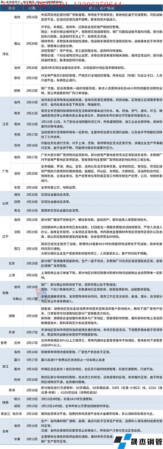 截至3月21日,匯總了16個(gè)省份停工停產(chǎn)最新信息。其中,3月21日,南京全市范圍內(nèi)除保障市民生活和城市基本運(yùn)行的水、電、燃油、燃?xì)?、通訊、環(huán)衛(wèi)、糧油肉菜供應(yīng)等公共服務(wù)類企事業(yè)單位外,其他有條件的單位盡可能安排居家辦公。3 月20日,唐山開平區(qū)、豐南區(qū)、灤州市、遷西縣全域?qū)嵤﹪?yán)格封控管理;大部分鋼企維持生產(chǎn),但政府實(shí)施道路管控,無縫厚壁鋼管廠家均面臨運(yùn)輸方面的問題。深圳全市福田、羅湖、南山、寶安、龍崗以及龍華暫未恢復(fù),全市封控區(qū)、管控區(qū)、防范區(qū)繼續(xù)嚴(yán)格執(zhí)行疫情防控相關(guān)措施。山東濰坊日照、青島萊西市實(shí)現(xiàn)社會(huì)面動(dòng)態(tài)清零。河北滄州連續(xù)4天實(shí)現(xiàn)社會(huì)面動(dòng)態(tài)清零,3月20日起部分地區(qū)逐步解除封控。具體情況如下: