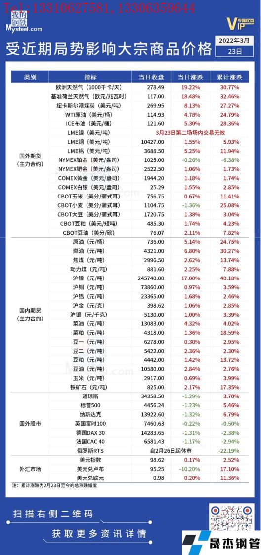 免責聲明:本網站(山東聊城晟杰無縫鋼管廠www.ahcom.com.cn)刊載的“受近期局勢影響大宗商品價格一覽表(3月23日)”等均源于網絡,版權歸原作者所有,且僅代表原作者觀點,本文所載信息僅供參考。轉載僅為學習與交流之目的,如無意中侵犯您的合法權益,請及時聯系刪除。本網站刊登此篇文章并不意味著本站贊同其觀點或證實其內容的真實性,我們不對其科學性、嚴肅性等作任何形式的保證。如果侵犯了您的版權,請盡快聯系我們予以撤銷,謝謝合作!