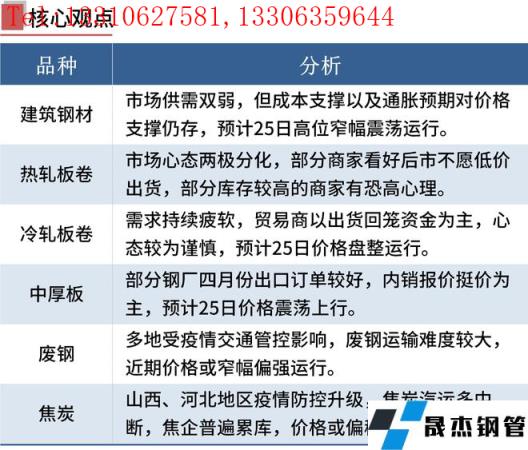 建筑厚壁無縫鋼管:3月24日,全國31個主要城市20mm三級抗震螺紋鋼均價4983元/噸,較上個交易日上漲18元/噸。本周螺紋鋼周產量連續第六周增加,總庫存由降轉升,廠庫連續第二周出現回升,表觀消費基本持平。目前來看,近期全國疫情呈現局部高度聚集和多點散發態勢,多個地區厚壁無縫鋼管市場供需面均有不同程度影響,雖然部分區域陸續恢復運行,但同時亦有其他區域疫情管控加嚴對于物流運輸及工程施工形成制約,影響終端需求釋放。目前現貨市場仍處于供需雙弱的局面,但成本支撐以及通脹預期對價格支撐仍存。因此預計25日國內建筑厚壁無縫鋼管價格或將高位窄幅震蕩運行為主。