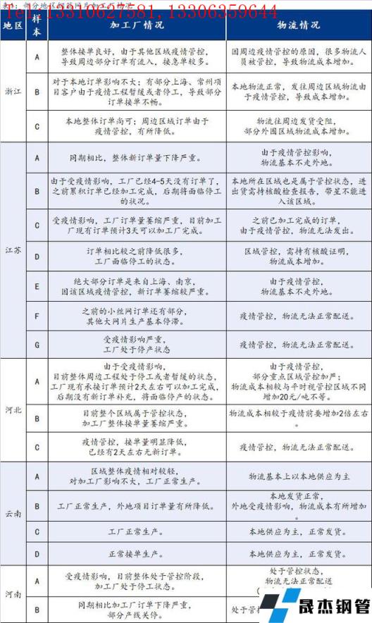 截至3月23日,匯總了部分省份19家鋼筋網片加工廠最新信息,其中浙江3家,江蘇7家,河北3家,云南4家,河南2家。從調研結果來看,江蘇、河北、河南受疫情影響較嚴重,因工程項目停工或者暫緩對于網片需求整體有遞延,導致加工廠新訂單相較于往年有個明顯的萎縮,部分沒有受太大影響的區域物流成本也有相應的增加。具體情況如下: