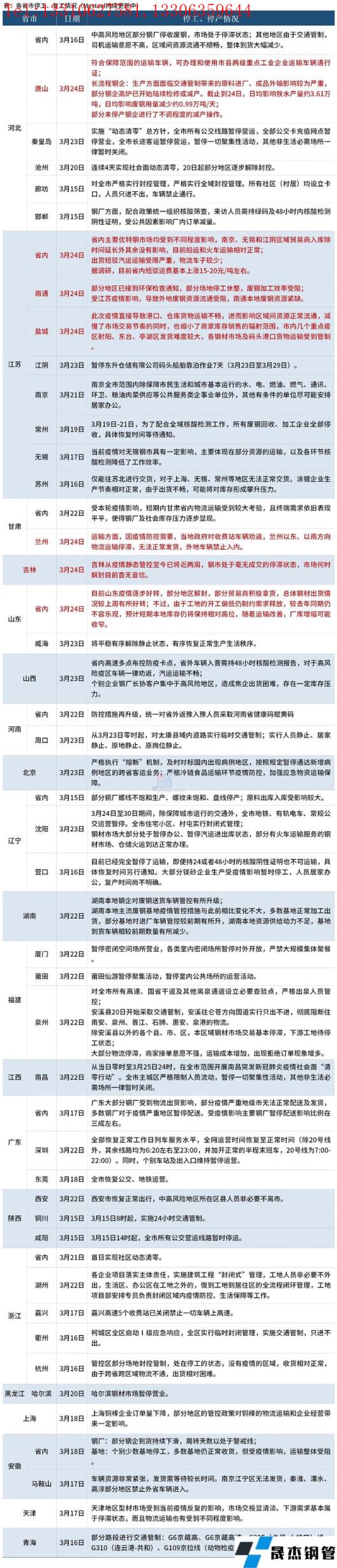 截至3月25日,匯總了20個省份停工復工最新信息。其中,河北唐山市符合保障范圍的運輸車輛,可辦理和使用市縣兩級重點工業企業運輸車輛通行證。江蘇南通部分地區已接到環保檢查通知,部分場地停工休整,廢鋼加工效率受阻。吉林從疫情靜態管控至3月24日將近兩周,鋼市處于毫無成交的停滯狀態,市場何時解封目前杳無音信。具體情況如下:
