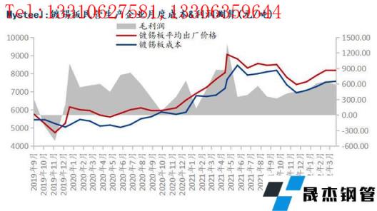 對民營企業(yè)成本&利潤測算數(shù)據(jù)顯示:2022年4月份鍍錫板生產(chǎn)成本7576.51元/噸,月環(huán)比增加48.2元/噸;毛利583.49元/噸,月環(huán)比下降68.2元/噸,同比下滑284.27元/噸,全流程企業(yè)整體利潤尚可。4月基板結(jié)算成本增加、疫情影響下,運(yùn)輸成本上漲明顯,錫錠成本窄幅回調(diào),鍍錫板出廠價格挺價意愿偏弱。