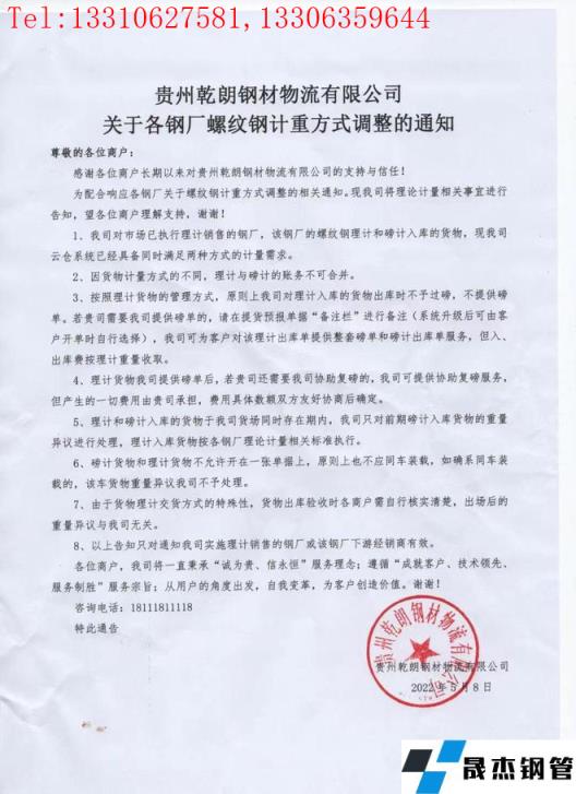 免責(zé)聲明:本網(wǎng)站(山東聊城晟杰無(wú)縫鋼管廠www.ahcom.com.cn)刊載的“貴州乾朗鋼材_無(wú)縫鋼管物流有限公司關(guān)于各無(wú)縫鋼管廠家螺紋鋼計(jì)重方式調(diào)整的通知”等均源于網(wǎng)絡(luò),版權(quán)歸原作者所有,且僅代表原作者觀點(diǎn),本文所載信息僅供參考。轉(zhuǎn)載僅為學(xué)習(xí)與交流之目的,如無(wú)意中侵犯您的合法權(quán)益,請(qǐng)及時(shí)聯(lián)系刪除。本網(wǎng)站刊登此篇文章并不意味著本站贊同其觀點(diǎn)或證實(shí)其內(nèi)容的真實(shí)性,我們不對(duì)其科學(xué)性、嚴(yán)肅性等作任何形式的保證。如果侵犯了您的版權(quán),請(qǐng)盡快聯(lián)系我們予以撤銷,謝謝合作!
