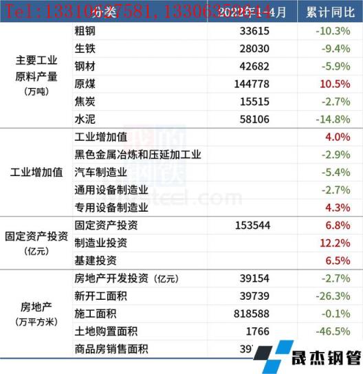 1-4月份,全國規模以上工業增加值同比增長4.0%,比1-3月份回落2.5個百分點。4月全國粗鋼日均產量309.27萬噸,環比增長8.6%。