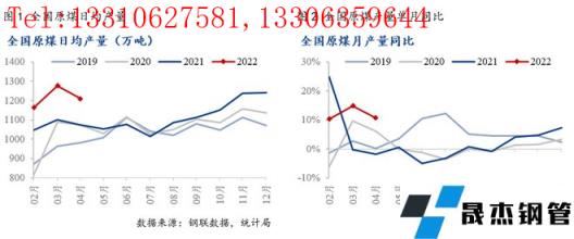 4月原煤生產(chǎn)大幅增長。4月份,全國生產(chǎn)原煤3.6億噸,同比增長10.7%,增速比上月放緩4.1個(gè)百分點(diǎn),日均產(chǎn)量1209萬噸。1—4月份,全國生產(chǎn)原煤14.5億噸,同比增長10.5%。4月疫情影響山西等地區(qū)煤礦生產(chǎn)以及運(yùn)輸,導(dǎo)致煤炭日均產(chǎn)量并未延續(xù)高產(chǎn)出,低于目標(biāo)值1260萬噸,不過在保供政策下,日均煤炭產(chǎn)量仍維持在1200萬噸以上,月度產(chǎn)量同比增長10.7%。