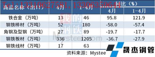 4月,中國出口鋼鐵棒材52萬噸,同比下降58.0%;1-4月累計出口180萬噸,同比下降57.4%。其他出口情況如下表所示: