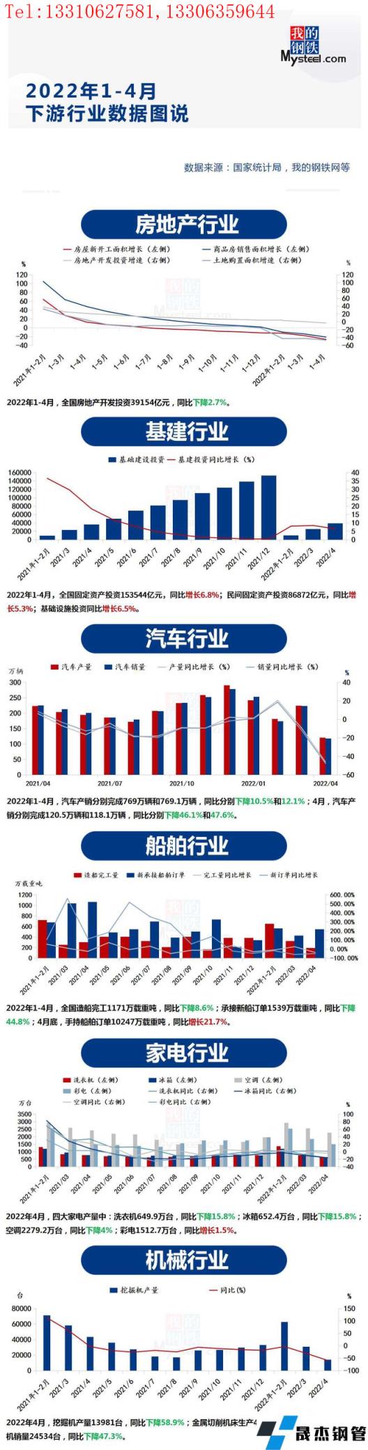 匯總了2022年1-4月部分下游用鋼行業的運行情況。