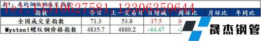 訊:全國建筑厚壁無縫鋼管成交量監(jiān)測,成交量相對指數(shù)來看,全國71.3增17.5,北方53.1增12.4,華東93.3增21.9,南方59.3增15.9。今日螺紋鋼價(jià)格指數(shù)4835.7,較上一交易日減44.47。