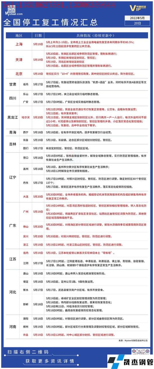 免責聲明:本網站(山東聊城晟杰無縫鋼管廠www.ahcom.com.cn)刊載的“疫情影響丨全國停工復工情況匯總(5月20日)”等均源于網絡,版權歸原作者所有,且僅代表原作者觀點,本文所載信息僅供參考。轉載僅為學習與交流之目的,如無意中侵犯您的合法權益,請及時聯系刪除。本網站刊登此篇文章并不意味著本站贊同其觀點或證實其內容的真實性,我們不對其科學性、嚴肅性等作任何形式的保證。如果侵犯了您的版權,請盡快聯系我們予以撤銷,謝謝合作!