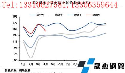 鋼鐵是終端制造業(yè)的重要生產(chǎn)原材料,以鋼鐵消費(fèi)趨勢為觀測視角可以較為準(zhǔn)確的判斷下游制造業(yè)發(fā)展?fàn)顩r。4月鋼鐵業(yè)供給指數(shù)為186.38,同比下降8.74%,環(huán)比增長6.78%。供應(yīng)方面,4月份唐山地區(qū)疫情影響因素減弱,無縫厚壁鋼管廠家陸續(xù)復(fù)產(chǎn),據(jù)統(tǒng)計(jì),4月五大品種產(chǎn)量環(huán)比增長3.6%。消費(fèi)方面,五大品種厚壁無縫鋼管消費(fèi)環(huán)比增長3.4%,同比下降16%。具體來看,受疫情和房企資金緊張影響,房地產(chǎn)投資和施工活動均受限,4月建筑厚壁無縫鋼管表觀消費(fèi)量同比下降28%,是厚壁無縫鋼管消費(fèi)的主要拖累項(xiàng)。制造業(yè)方面,疫情對制造業(yè)供應(yīng)鏈沖擊較大,4月PMI指數(shù)錄得47.4%,環(huán)比上月繼續(xù)大幅下滑2.1個百分點(diǎn),是2020年疫情以來最低的水平,企業(yè)生產(chǎn)、訂單指數(shù)明顯下滑,熱卷消費(fèi)同比下降3.45%。