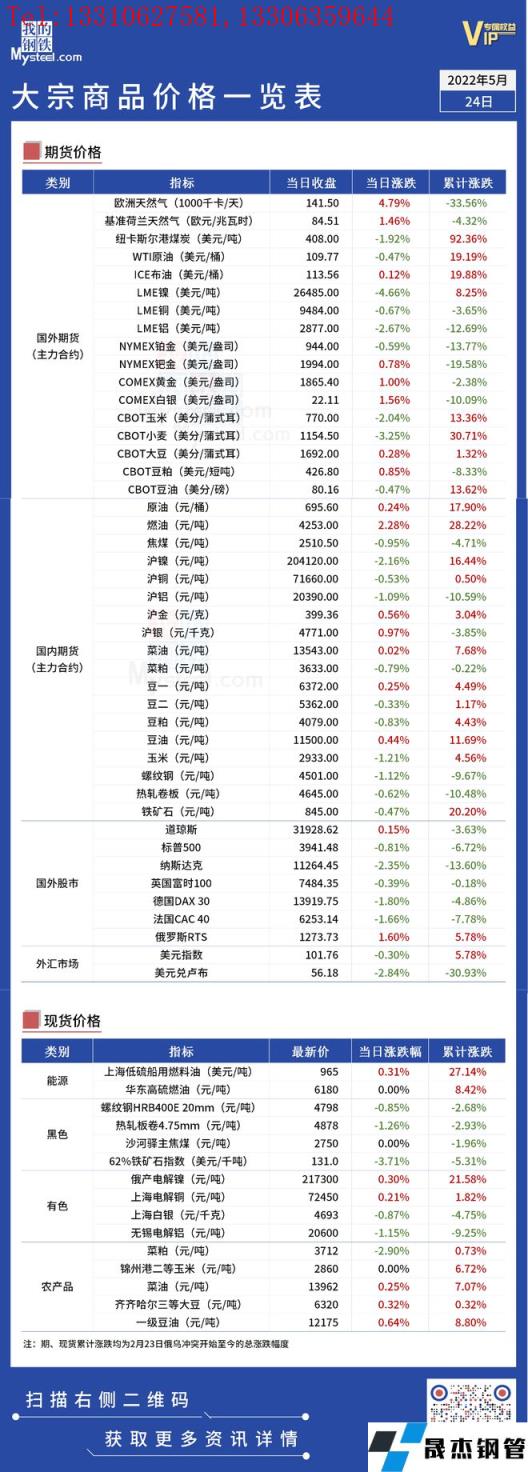 免責聲明:本網站(山東聊城晟杰無縫鋼管廠www.ahcom.com.cn)刊載的“俄烏局勢丨大宗商品價格一覽表(5月24日)”等均源于網絡,版權歸原作者所有,且僅代表原作者觀點,本文所載信息僅供參考。轉載僅為學習與交流之目的,如無意中侵犯您的合法權益,請及時聯系刪除。本網站刊登此篇文章并不意味著本站贊同其觀點或證實其內容的真實性,我們不對其科學性、嚴肅性等作任何形式的保證。如果侵犯了您的版權,請盡快聯系我們予以撤銷,謝謝合作!