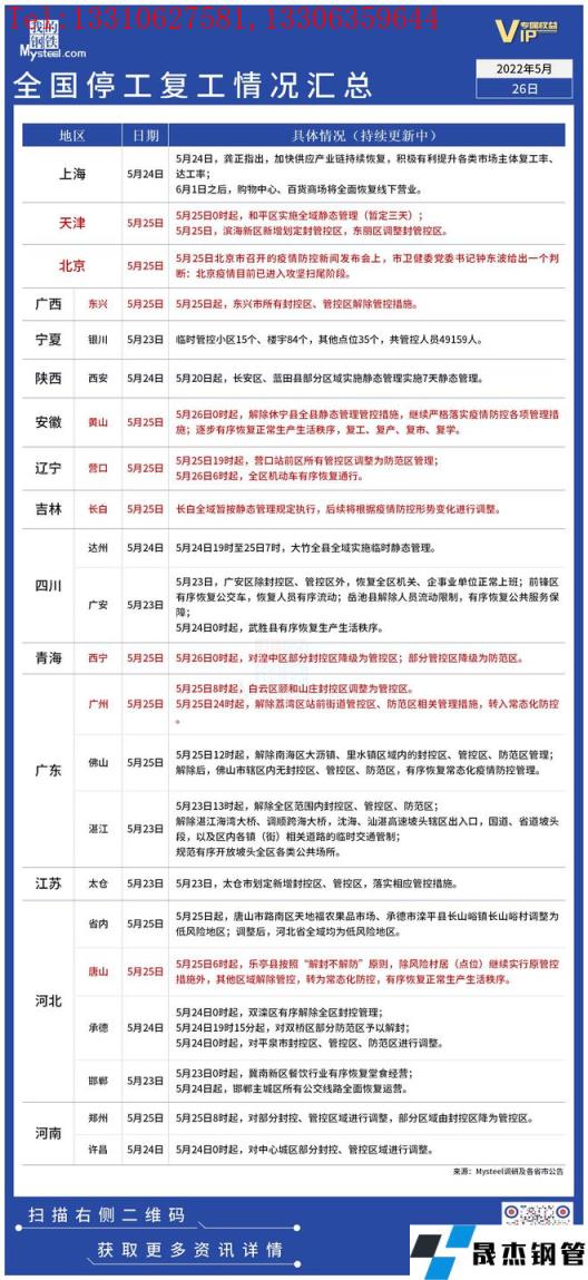 免責聲明:本網站(山東聊城晟杰無縫鋼管廠www.ahcom.com.cn)刊載的“疫情影響丨全國停工復工情況匯總(5月26日)”等均源于網絡,版權歸原作者所有,且僅代表原作者觀點,本文所載信息僅供參考。轉載僅為學習與交流之目的,如無意中侵犯您的合法權益,請及時聯系刪除。本網站刊登此篇文章并不意味著本站贊同其觀點或證實其內容的真實性,我們不對其科學性、嚴肅性等作任何形式的保證。如果侵犯了您的版權,請盡快聯系我們予以撤銷,謝謝合作!