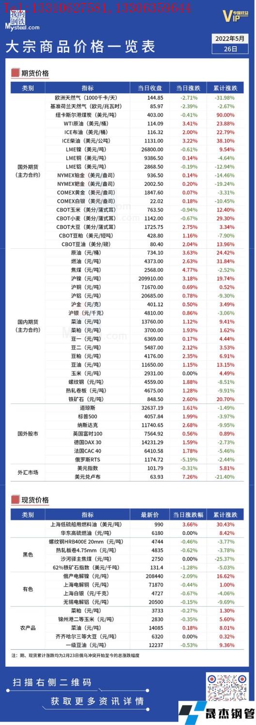 免責聲明:本網站(山東聊城晟杰無縫鋼管廠www.ahcom.com.cn)刊載的“俄烏局勢丨大宗商品價格一覽表(5月26日)”等均源于網絡,版權歸原作者所有,且僅代表原作者觀點,本文所載信息僅供參考。轉載僅為學習與交流之目的,如無意中侵犯您的合法權益,請及時聯系刪除。本網站刊登此篇文章并不意味著本站贊同其觀點或證實其內容的真實性,我們不對其科學性、嚴肅性等作任何形式的保證。如果侵犯了您的版權,請盡快聯系我們予以撤銷,謝謝合作!
