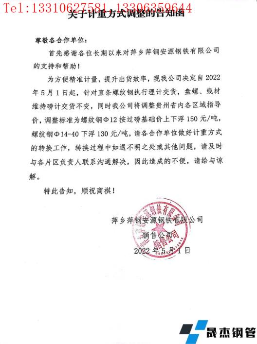 免責聲明:本網站(山東聊城晟杰無縫鋼管廠www.ahcom.com.cn)刊載的“萍鄉萍鋼安源鋼鐵有限公司關于對貴州區域計重方式調整的告知函”等均源于網絡,版權歸原作者所有,且僅代表原作者觀點,本文所載信息僅供參考。轉載僅為學習與交流之目的,如無意中侵犯您的合法權益,請及時聯系刪除。本網站刊登此篇文章并不意味著本站贊同其觀點或證實其內容的真實性,我們不對其科學性、嚴肅性等作任何形式的保證。如果侵犯了您的版權,請盡快聯系我們予以撤銷,謝謝合作!