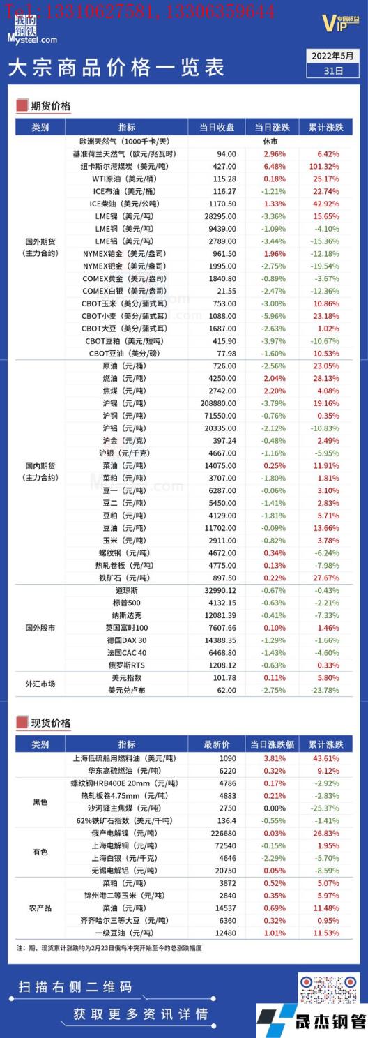 免責聲明:本網站(山東聊城晟杰無縫鋼管廠www.ahcom.com.cn)刊載的“俄烏局勢丨大宗商品價格一覽表(5月31日)”等均源于網絡,版權歸原作者所有,且僅代表原作者觀點,本文所載信息僅供參考。轉載僅為學習與交流之目的,如無意中侵犯您的合法權益,請及時聯系刪除。本網站刊登此篇文章并不意味著本站贊同其觀點或證實其內容的真實性,我們不對其科學性、嚴肅性等作任何形式的保證。如果侵犯了您的版權,請盡快聯系我們予以撤銷,謝謝合作!