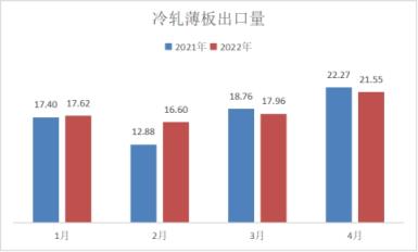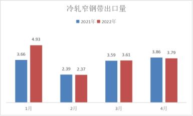 冷軋品種出口方面,4月份出口量同比下降,尤其以冷軋薄寬帶下降幅度最大,具體數(shù)據(jù)來(lái)看,冷軋薄板出口量為21.55萬(wàn)噸,同比下降3.23%;冷軋薄寬帶出口量為21.5萬(wàn)噸,同比下降64.46%,冷軋窄鋼帶出口量為3.79萬(wàn)噸,同比下降1.81%。