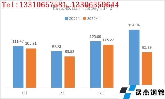 2022年4月我國鍍層板(帶)出口總量共計95.29萬噸,月環(huán)比降幅17.33%,年同比降幅38.50%;2022年1-4月份我國鍍層板(帶)出口總量共計399.99萬噸,年同比降幅18.02%。