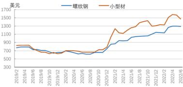 美國長材價(jià)格小幅下跌。6月底,美國中西部無縫鋼管廠家螺紋鋼價(jià)格下跌10美元至1290美元,進(jìn)口螺紋鋼價(jià)格下跌175美元至1075美元;中西部無縫鋼管廠家小型材價(jià)格下跌95美元至1475美元,進(jìn)口小型材價(jià)格下跌70美元至1360美元。美聯(lián)儲持續(xù)加息,利率的快速上調(diào)增加購房者負(fù)擔(dān),將對房地產(chǎn)市場形成壓制,影響厚壁鋼管需求。紐柯厚壁無縫鋼管于6月14日宣布將線材價(jià)格下調(diào)40美元/短噸,美國厚壁無縫鋼管公司Optimus Steel宣布自7月1日起其線材價(jià)格下調(diào)40美元/短噸。綜合來看,7月份北美市場長材價(jià)格或延續(xù)震蕩調(diào)整走勢。
