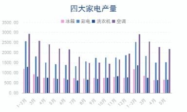 1-5月份,冰箱產(chǎn)量3401.0萬臺,同比下降8.1%;彩電產(chǎn)量7441.0萬臺,同比增長4.5%;洗衣機(jī)產(chǎn)量3471.7萬臺,同比下降4.1%;空調(diào)產(chǎn)量9933.5萬臺,同比下降0.8%。