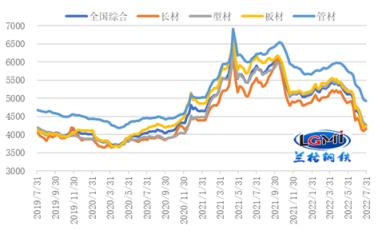 但隨著7月份需求有所回落,企業生產經營活動放緩,經濟回升動力偏弱。中國物流與采購聯合會、國家統計局服務業調查中心發布的2022年7月份中國制造業采購經理指數(PMI)為49.0%,比上月回落1.2個百分點。7月份PMI指數再度回落至榮枯線之下,表明經濟運行受多地高溫多雨短期季節性影響有所波動,疊加國內疫情仍呈散發態勢,外部形勢更趨復雜嚴峻,市場需求有所承壓,后期板材需求或承壓恢復。