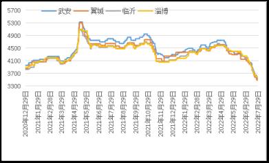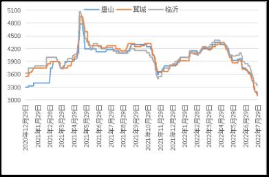 據(jù)云商平臺監(jiān)測數(shù)據(jù)顯示,截至7月29日,煉鋼生鐵天津地區(qū)報價3120元(噸價,下同),較月初跌550元;唐山地區(qū)報價3150元,較月初跌550元;翼城地區(qū)報價3100元,較月初跌620元;臨沂地區(qū)報價3350元,較月初跌500元(詳見圖2)。